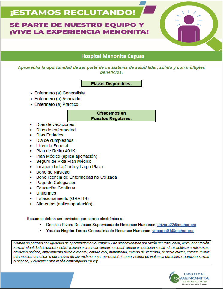This item is not available. Browse the similar products in category: You are here: Home Convocatoria de Empleo en el Hospital Menonita de Caguas Convocatoria de Empleo en el Hospital Menonita de Caguas Added marzo 25, 2026 | Advert ID: 10764 Descarga Documento (PDF) Contact this advertiser Your name Your email Message Website: https://cpepr.org/ Created by: No name