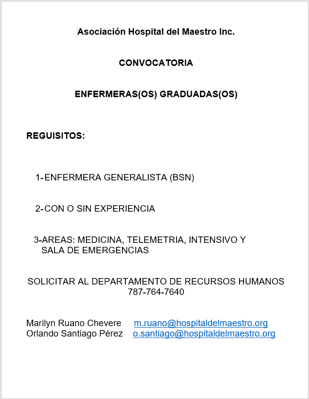 Convocatoria de empleo para puesto de Enfermera(o) Graduada(o) BSN por la Asociación del Hospital del Maestro Inc.