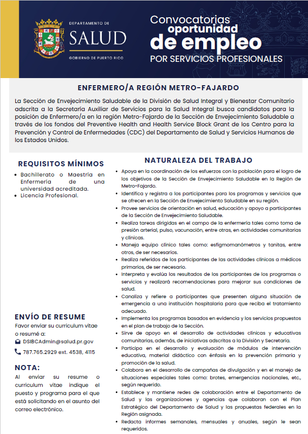 Convocatoria de Empleo Enfermera(o) en la Región Metro de Fajardo